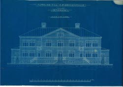 Ritningen visar det gamla landstingshuset, som än idag finns kvar vid Joe Hill-platsen söder om nuvarande regionkontoret. Till vänster i ritningen syns Folkets hus. Ritningen är från 1940-talet, men tyvärr inte signerad. Vi vet dock att det var Sten Dalén som var arkitekt och att den nya förvaltningsbyggnaden stod klar 1949. Redan under 1960-talet började landstinget växa ur byggnaden till följd av nya ansvarsområden och ytterligare ett nytt förvaltningshus stod klart 1975, denna gång på Kyrkogatan 4.